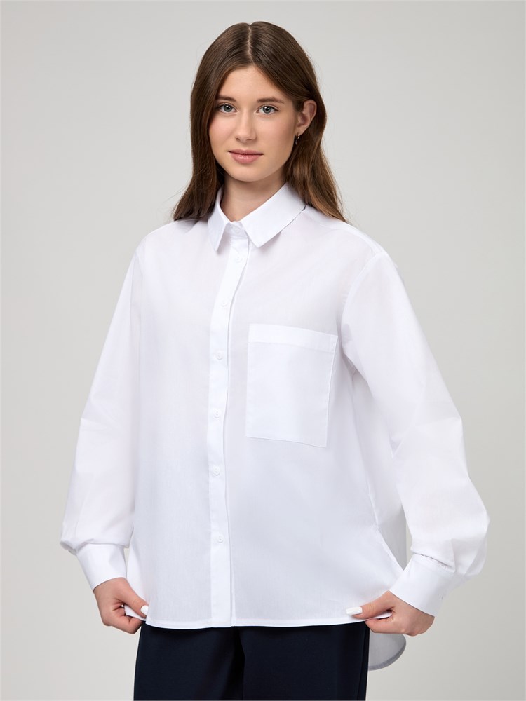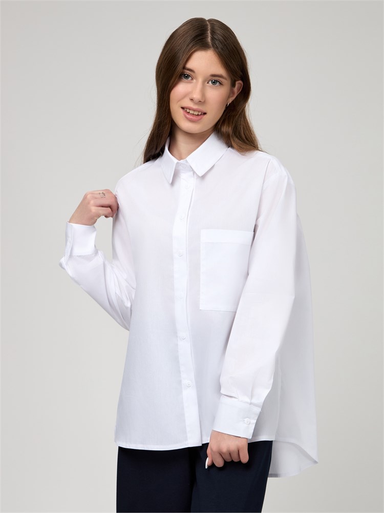 Блузка оверсайз школьная для девочки, с одним накладным карманом. Классическая блузка оверсайз имеет стильный крой спины. Модная и стильная рубашка оверсайз подойдёт как школьная форма для девочек, а также как праздничная и нарядная блузка. Школьная блузка оверсайз для девочки подростка - идеальный выбор в школу. Рубашка имеет свободный крой, который позволяет девочкам чувствовать себя уютно весь день.