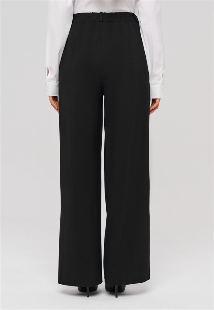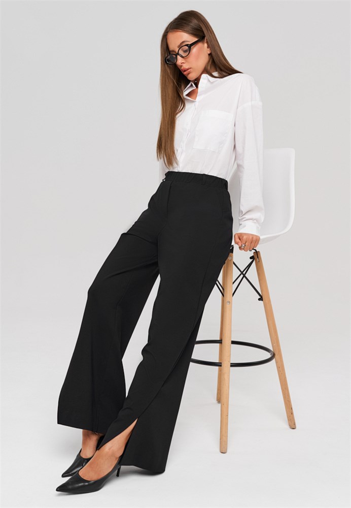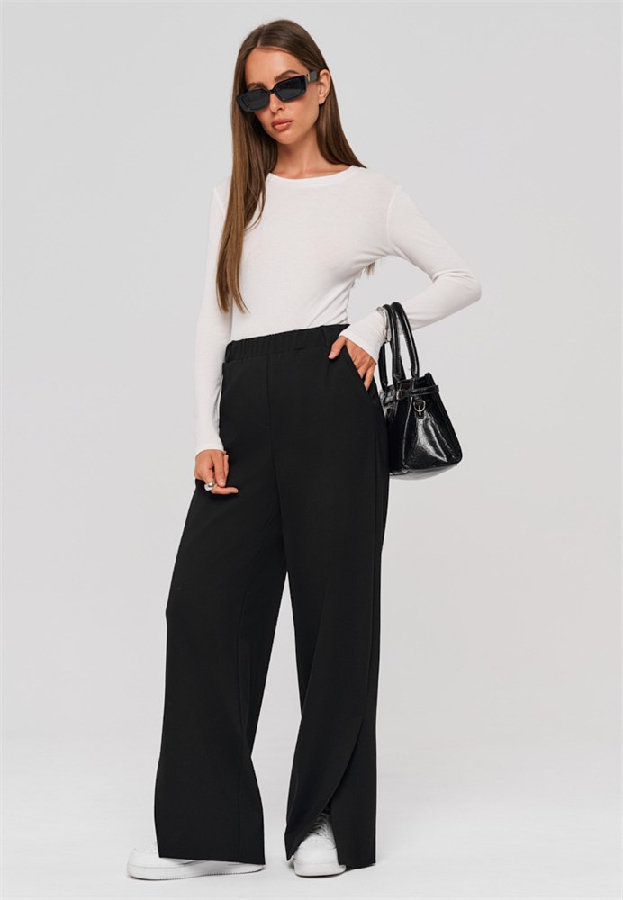 Брюки женские черные прямые. Брюки женские трубы позволяют сохранить свободу движений и подходят для любого типа фигуры. По низу брюк, в боковом шве разрез – щлица, которая плавно заходит на переднюю половинку брюк и создает элегантный силуэт и легкий образ. Брюки прямые женские черные выполнены из качественной, плотной, приятной на ощупь трикотажной ткани, которая не вытягивается и не скатывается при активном образе жизни. Брюки женские стрейч черные не деформируются после стирки. Брюки женские трикотажные отличное решение для тех, кто ценит удобство и долговечность одежды. Пояс на резинке обеспечивает отличную посадку без необходимости ремня, а боковые карманы добавляют практичности. Брюки классические женские с разрезом создадут модный образ, а также подчеркнут индивидуальность каждой девушки. Брюки офисные женские привлекательны своим дизайном и функциональностью. Брюки деловые женские идеальны как для повседневной носки, так и для более официальных мероприятий. Брюки черные женские классические гармонич