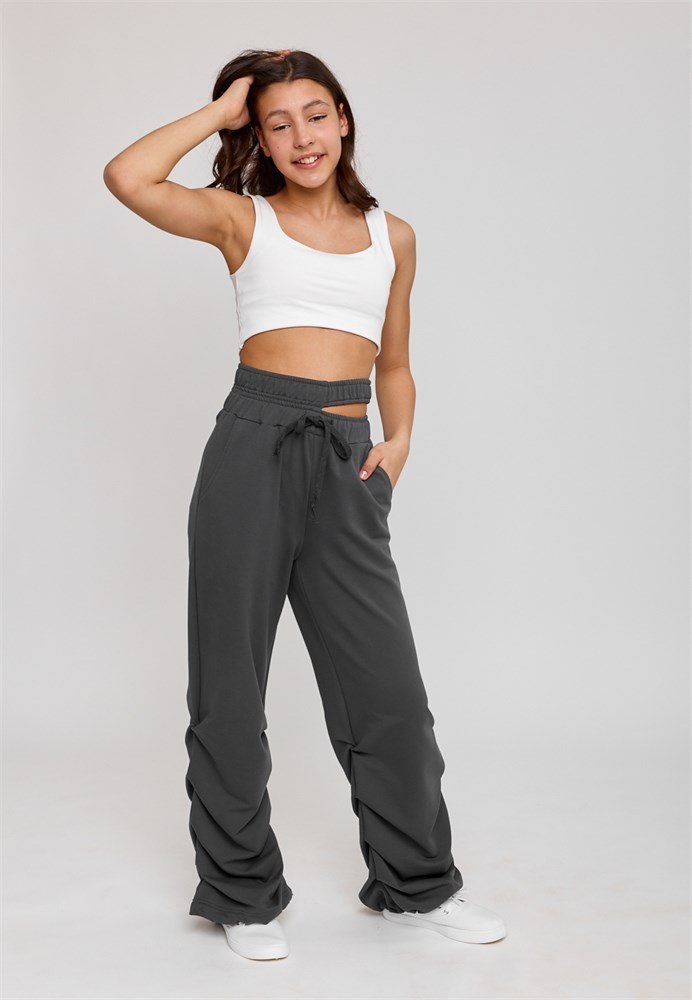 Брюки для девочки серые - идеальный выбор для вашей девочки, которая хочет быть модной и стильной в любой ситуации. Брюки прямые для девочки подростка изготовлены из мягкого тонкого петельного хлопкового трикотажа. Спортивные штаны для девочки графит из трикотажа отлично подойдут летом на каждый день, для прогулок, для дома и для спорта. Брюки для девочки однотонные станут отличным выбором для активных и стильных модниц на весну и в прохладную погоду. Брюки для девочки подростка необычные и уникальные: двойная резинка на поясе, плотно прилегает к телу, а разрез между ними позволяет создавать интересные и дерзкие образы, а также регулировать посадку на фигуре. По низу брюк, в швах складки создают объем и драпировку, что делает брюки для подростков уникальными и интересными. Брюки для девочки летние утягиваются на резинку и фиксируются, что позволяет регулировать ширину штанин по низу. Карманы придают практичность и удобство в носке. Благодаря удобной мягкой резинке в поясе, брюки спортивные прямые не сползают