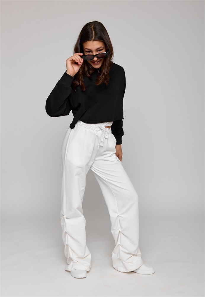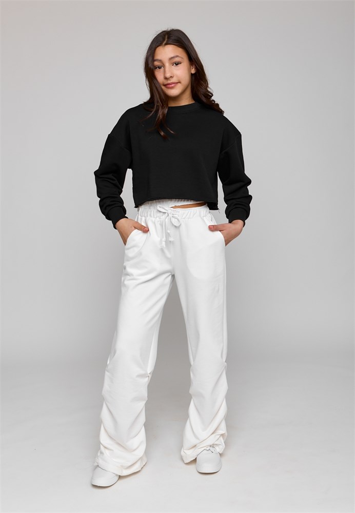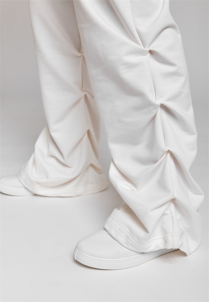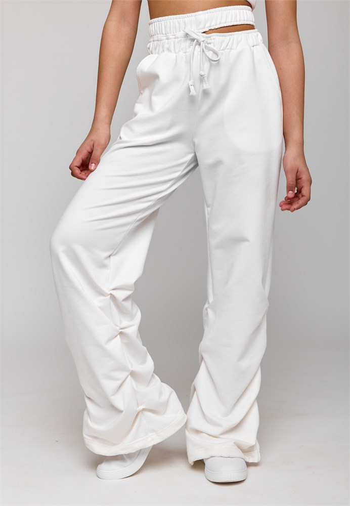 Брюки для девочки белые - идеальный выбор для вашей девочки, которая хочет быть модной и стильной в любой ситуации. Брюки прямые для девочки подростка изготовлены из мягкого тонкого петельного хлопкового трикотажа. Спортивные штаны для девочки светлые из трикотажа отлично подойдут летом на каждый день, для прогулок, для дома и для спорта. Брюки для девочки однотонные светлые станут отличным выбором для активных и стильных модниц на весну и в прохладную погоду. Брюки для девочки подростка необычные и уникальные: двойная резинка на поясе, плотно прилегает к телу, а разрез между ними позволяет создавать интересные и дерзкие образы, а также регулировать посадку на фигуре. По низу брюк, в швах складки создают объем и драпировку, что делает брюки для подростков уникальными и интересными. Брюки для девочки летние утягиваются на резинку и фиксируются, что позволяет регулировать ширину штанин по низу. Карманы придают практичность и удобство в носке. Благодаря удобной мягкой резинке в поясе, брюки спортивные прямые не