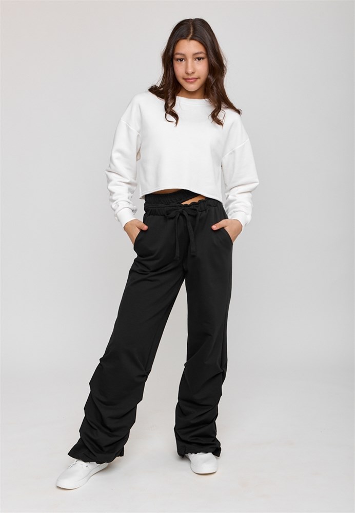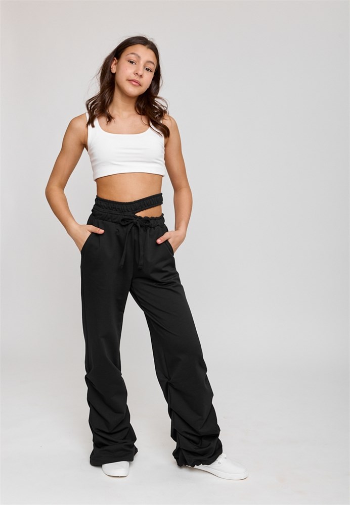 Брюки для девочки черные - идеальный выбор для вашей девочки, которая хочет быть модной и стильной в любой ситуации. Брюки прямые для девочки подростка изготовлены из мягкого тонкого петельного хлопкового трикотажа. Спортивные штаны для девочки черные из трикотажа отлично подойдут летом на каждый день, для прогулок, для дома и для спорта. Брюки для девочки однотонные станут отличным выбором для активных и стильных модниц на весну и в прохладную погоду. Брюки для девочки подростка необычные и уникальные: двойная резинка на поясе, плотно прилегает к телу, а разрез между ними позволяет создавать интересные и дерзкие образы, а также регулировать посадку на фигуре. По низу брюк, в швах складки создают объем и драпировку, что делает брюки для подростков уникальными и интересными. Брюки для девочки летние утягиваются на резинку и фиксируются, что позволяет регулировать ширину штанин по низу. Карманы придают практичность и удобство в носке. Благодаря удобной мягкой резинке в поясе, брюки спортивные прямые не сползаю