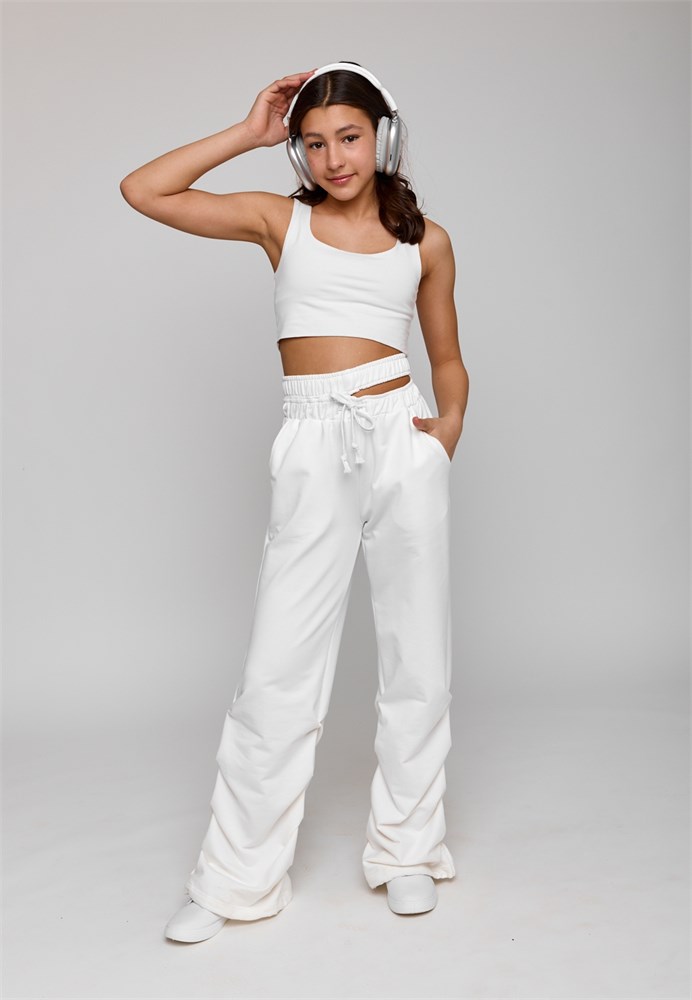 Брюки для девочки белые - идеальный выбор для вашей девочки, которая хочет быть модной и стильной в любой ситуации. Брюки прямые для девочки подростка изготовлены из мягкого тонкого петельного хлопкового трикотажа. Спортивные штаны для девочки светлые из трикотажа отлично подойдут летом на каждый день, для прогулок, для дома и для спорта. Брюки для девочки однотонные светлые станут отличным выбором для активных и стильных модниц на весну и в прохладную погоду. Брюки для девочки подростка необычные и уникальные: двойная резинка на поясе, плотно прилегает к телу, а разрез между ними позволяет создавать интересные и дерзкие образы, а также регулировать посадку на фигуре. По низу брюк, в швах складки создают объем и драпировку, что делает брюки для подростков уникальными и интересными. Брюки для девочки летние утягиваются на резинку и фиксируются, что позволяет регулировать ширину штанин по низу. Карманы придают практичность и удобство в носке. Благодаря удобной мягкой резинке в поясе, брюки спортивные прямые не