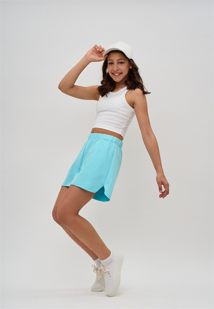 Шорты для девочки бирюзовые из трикотажа. Шорты для девочки летние молодежные - отличный выбор для активных занятий и спортивных мероприятий. Шорты летние светлые специально разработанные для подростков, имеют стандартную посадку с широкой резинкой, гарантирующей отличную посадку и комфортную носку. Шорты детские яркие прямые с карманами, по боковым швам закругленные разрезы и низ шорт с открытым не обработанным срезом, добавляют модности и актуальности образу. Шорты для подростка летние, подходят для различных активностей, будь то спортивные тренировки, танцы или просто прогулку на свежем воздухе. Шорты трикотажные голубые из футера, создают комфорт и свободу движений в течение всего дня. Данный материал делает укороченные шорты мягкими и приятными к телу, позволяя коже дышать и подойдут для жаркого летнего сезона. Шорты школьные для девочки, станут незаменимым выбором для школы, для сада, для дома и для пляжного отдыха. Легкие и стильные детские трикотажные шорты – идеальны для активных девочек!