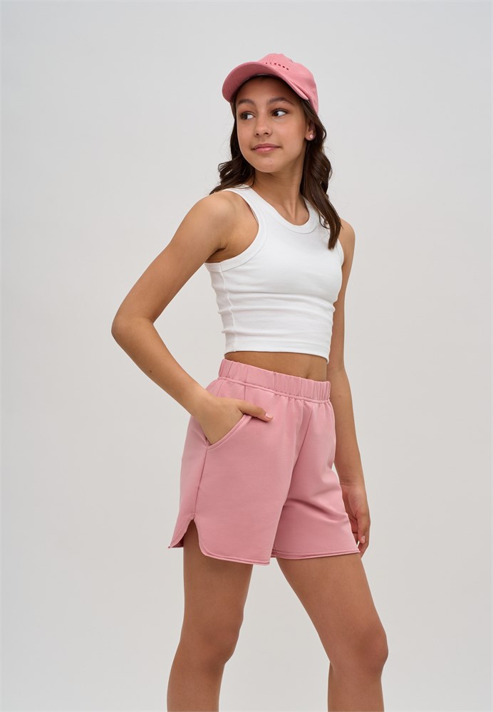 Шорты для девочки розовые из трикотажа. Шорты для девочки летние молодежные - отличный выбор для активных занятий и спортивных мероприятий. Шорты летние светлые специально разработанные для подростков, имеют стандартную посадку с широкой резинкой, гарантирующей отличную посадку и комфортную носку. Шорты детские прямые с карманами, по боковым швам закругленные разрезы и низ шорт с открытым не обработанным срезом, добавляют модности и актуальности образу. Шорты для подростка летние, пыльно-розового цвета подходят для различных активностей, будь то спортивные тренировки, танцы или просто прогулку на свежем воздухе. Шорты трикотажные розовые из футера, создают комфорт и свободу движений в течение всего дня. Данный материал делает укороченные шорты мягкими и приятными к телу, позволяя коже дышать и подойдут для жаркого летнего сезона. Шорты школьные для девочки, станут незаменимым выбором для школы, для сада, для дома и для пляжного отдыха. Легкие и стильные детские трикотажные шорты – идеальны для активных девоче