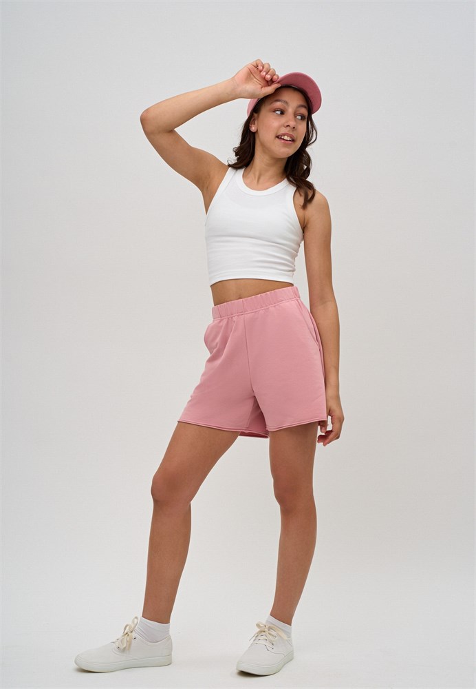 Шорты для девочки розовые из трикотажа. Шорты для девочки летние молодежные - отличный выбор для активных занятий и спортивных мероприятий. Шорты летние светлые специально разработанные для подростков, имеют стандартную посадку с широкой резинкой, гарантирующей отличную посадку и комфортную носку. Шорты детские прямые с карманами, по боковым швам закругленные разрезы и низ шорт с открытым не обработанным срезом, добавляют модности и актуальности образу. Шорты для подростка летние, пыльно-розового цвета подходят для различных активностей, будь то спортивные тренировки, танцы или просто прогулку на свежем воздухе. Шорты трикотажные розовые из футера, создают комфорт и свободу движений в течение всего дня. Данный материал делает укороченные шорты мягкими и приятными к телу, позволяя коже дышать и подойдут для жаркого летнего сезона. Шорты школьные для девочки, станут незаменимым выбором для школы, для сада, для дома и для пляжного отдыха. Легкие и стильные детские трикотажные шорты – идеальны для активных девоче