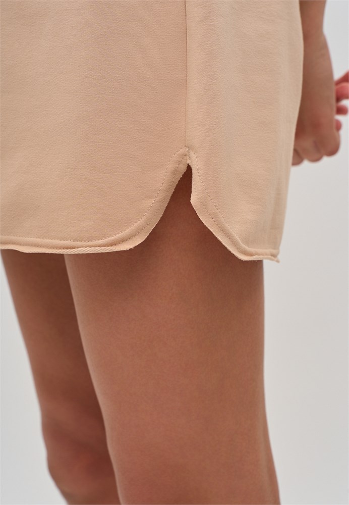 Шорты для девочки бежевые из трикотажа. Шорты для девочки летние молодежные - отличный выбор для активных занятий и спортивных мероприятий. Шорты летние светлые специально разработанные для подростков, имеют стандартную посадку с широкой резинкой, гарантирующей отличную посадку и комфортную носку. Шорты детские прямые с карманами, по боковым швам закругленные разрезы и низ шорт с открытым не обработанным срезом, добавляют модности и актуальности образу. Шорты для подростка летние, подходят для различных активностей, будь то спортивные тренировки, танцы или просто прогулку на свежем воздухе. Шорты трикотажные бежевые из футера, создают комфорт и свободу движений в течение всего дня. Данный материал делает укороченные шорты мягкими и приятными к телу, позволяя коже дышать и подойдут для жаркого летнего сезона. Шорты школьные для девочки, станут незаменимым выбором для школы, для сада, для дома и для пляжного отдыха. Легкие и стильные детские трикотажные шорты – идеальны для активных девочек!