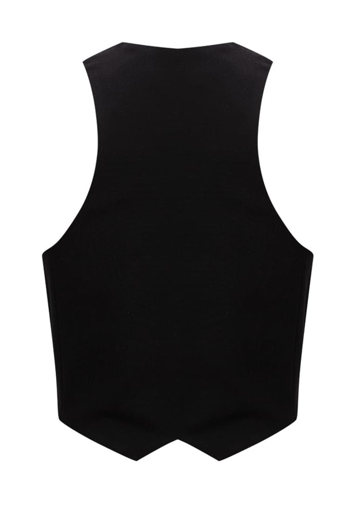 Укороченный жилет, застегивается на три серебристые декоративные пуговицы; Состав: Вискоза - 60%, Нейлон - 35 %, Эластан - 5%.